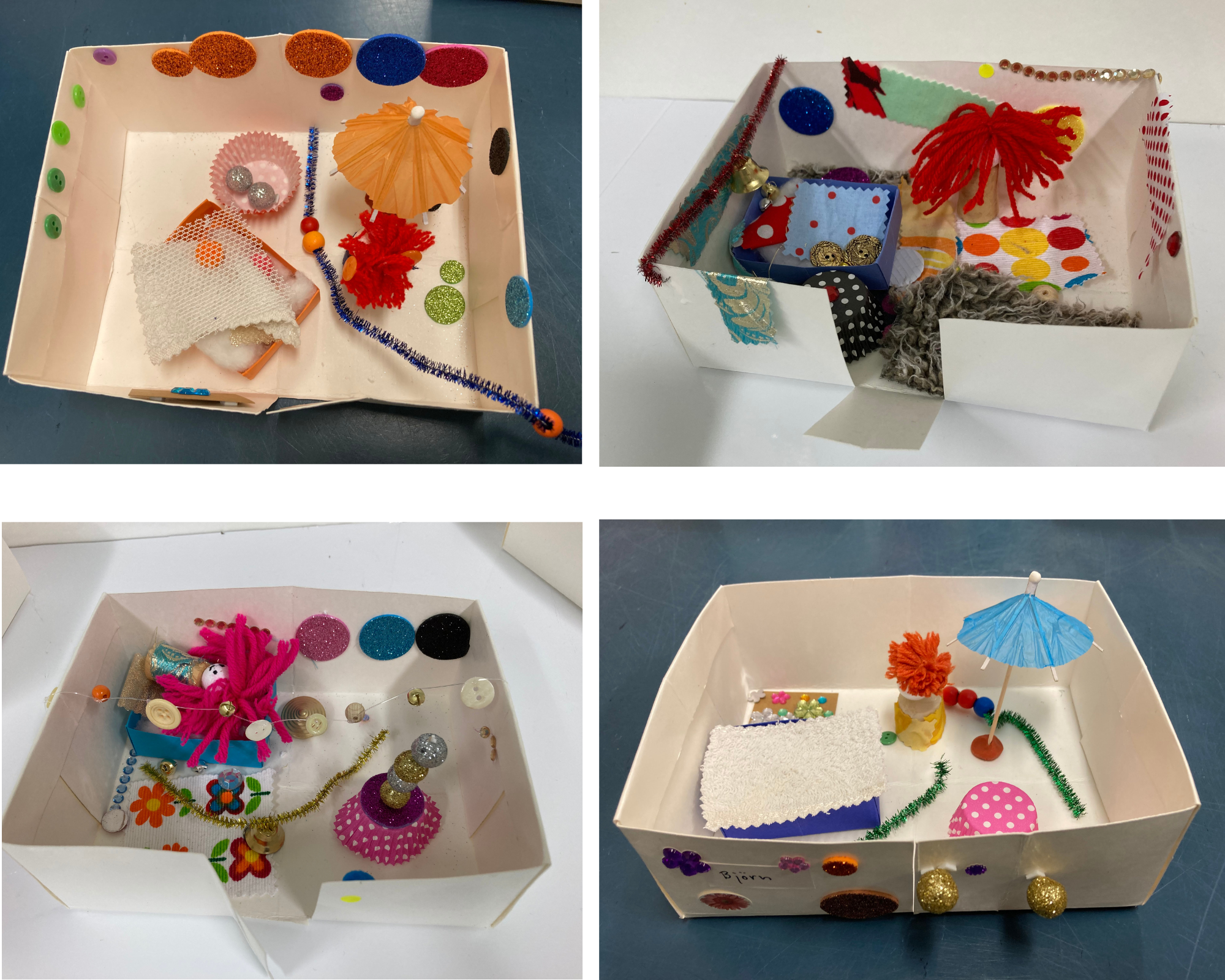 Vi följer med på Olgas äventyr och bygger vår egen lilla värld med små kartonghus som vi dekorerar. Vilken tur att Musen har sin fantastiska glitterkiosk med sig: där får man i utbyte mot ord allt man behöver för att pyssla och dekorera!
